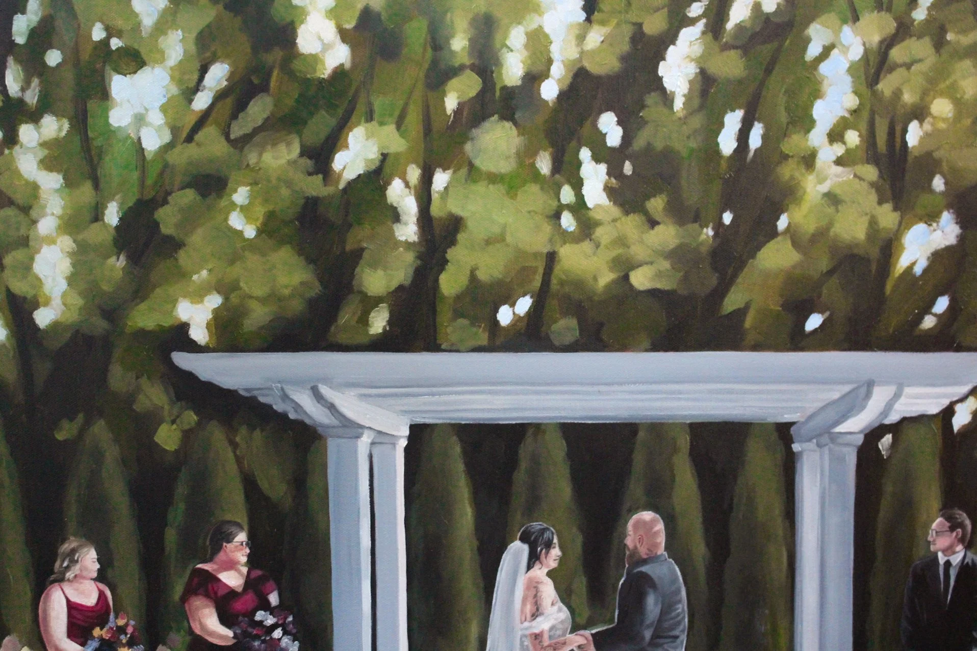 On the day of the wedding, I will show up early to set up and begin painting the background. I’ll take a photo for reference of whatever scene you choose, and will continue painting throughout the reception as entertainment for your guests. After the wedding, I’ll take the painting back to the studio for final touch ups, and you’ll receive the finished painting 2-4 weeks later.
