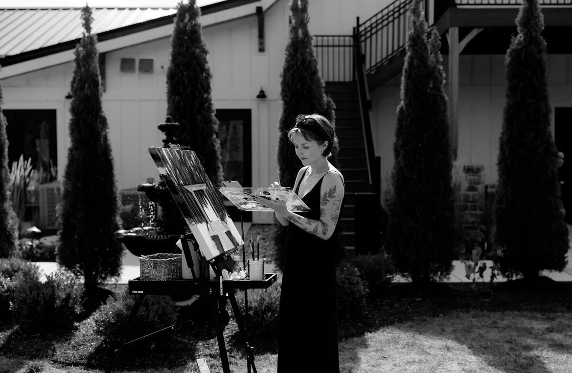 I was asked to do my first live wedding painting in 2021, and was struck by the level of trust that was given to me for this task. Though I didn’t pursue wedding painting further at this time, it was always something I thought about as a very special and unique experience. After moving back to the U.S. from London in 2024, I was asked to do another live wedding painting, and then another, and have continued to have the pleasure of capturing weddings from then on.